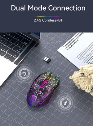 Trådlös spelmus med dubbla lägen (Bluetooth + 2,4 GHz) – Uppladdningsbar RGB-ljud med tyst klick